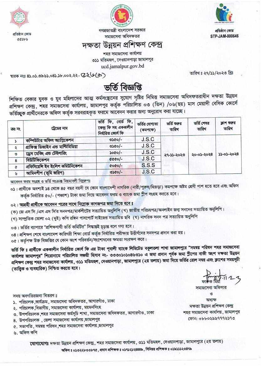 সমাজকল্যাণ মন্ত্রণালয়াধীন সমাজসেবা অধিদফতর কর্তৃক ১৯৫৫ সালে ঢাকা শহরের বস্তি এলাকায় জনসাধারণের জীবনযাত্রার মান উন্নয়নের জন্য শহর সমাজ উন্নয়ন কার্যক্রম (ইউসিডি) চালু হয়। এ কার্যক্রমের আওতায় শহর এলাকায় অবস্থিত শহর সমাজসেবা কার্যালয়সমূহের মাধ্যমে শহরে বসবাসরত শিক্ষিত, অর্ধ শিক্ষিত বেকার যুবক ও যুব মহিলাদের সেলাই, কম্পিউটার, হাঁসমুরগি পালন ও যুগোপযোগী স্থানীয় চাহিদা অনুযায়ী বিভিন্ন ট্রেডে স্বল্প মেয়াদী ও দীর্ঘ মেয়াদী কারিগরি প্রশিক্ষণ প্রদানের মাধ্যমে দক্ষ জনশক্তি সৃষ্টি ও কর্মসংস্থানের সুযোগ সৃষ্টির মাধ্যমে আর্থ সামাজিক উন্নয়নে সহায়তা করা এ প্রশিক্ষণ কার্যক্রমের মূল উদ্দেশ্য।